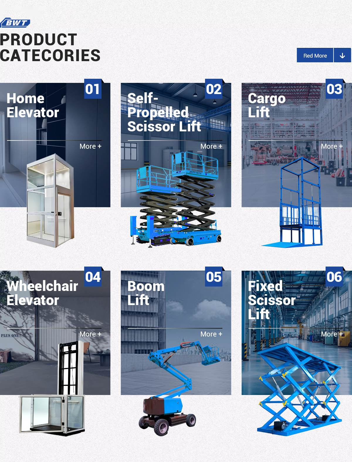 Productos principales:Elevador de casa, elevador de tijera autopropulsado, elevador de pluma, elevador de tijera fijo, elevador de carga/elevador de carga